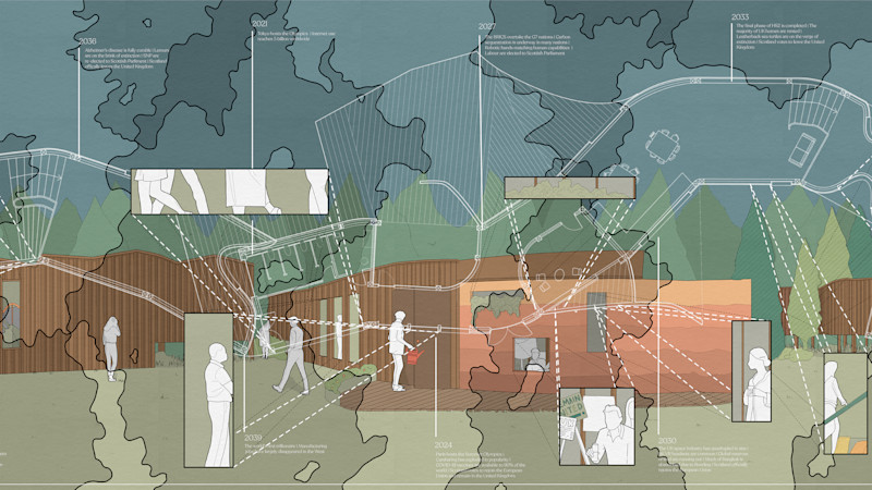 Set against the backdrop of current politics, the Debatable Forest looks at the ever-changing relationship between Scotland and England. The project examines two decades, experiencing the highs and lows of European Independence, Scottish Independence, General Elections, Debate, Political Blunders, and the Changing Modern World. The programme takes two villages on either side of the border, Nookfoot and Alberig. With the villages holding opposing political opinions, the architecture aims to facilitate debate between the two communities and offer space for reconciliation.