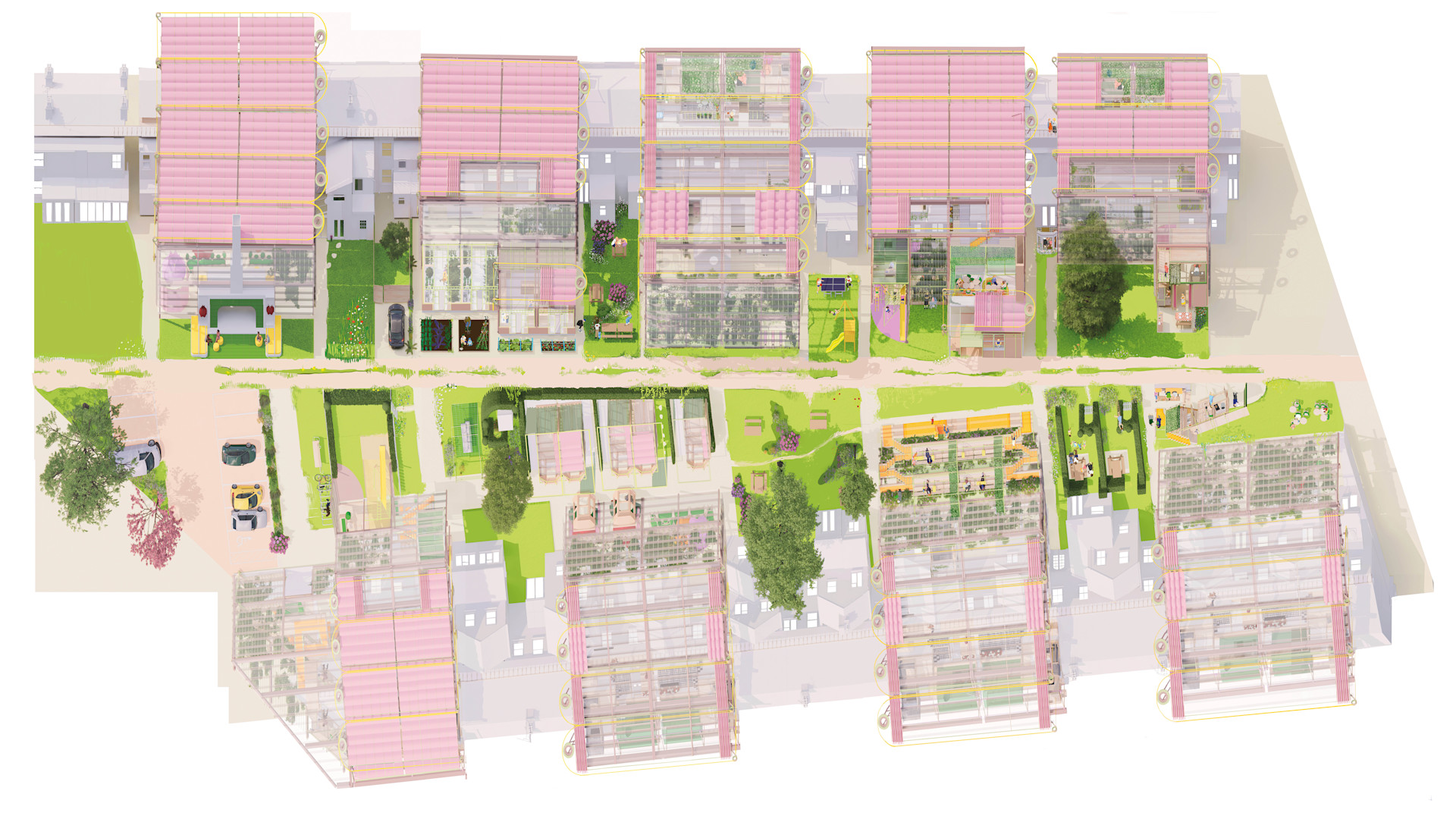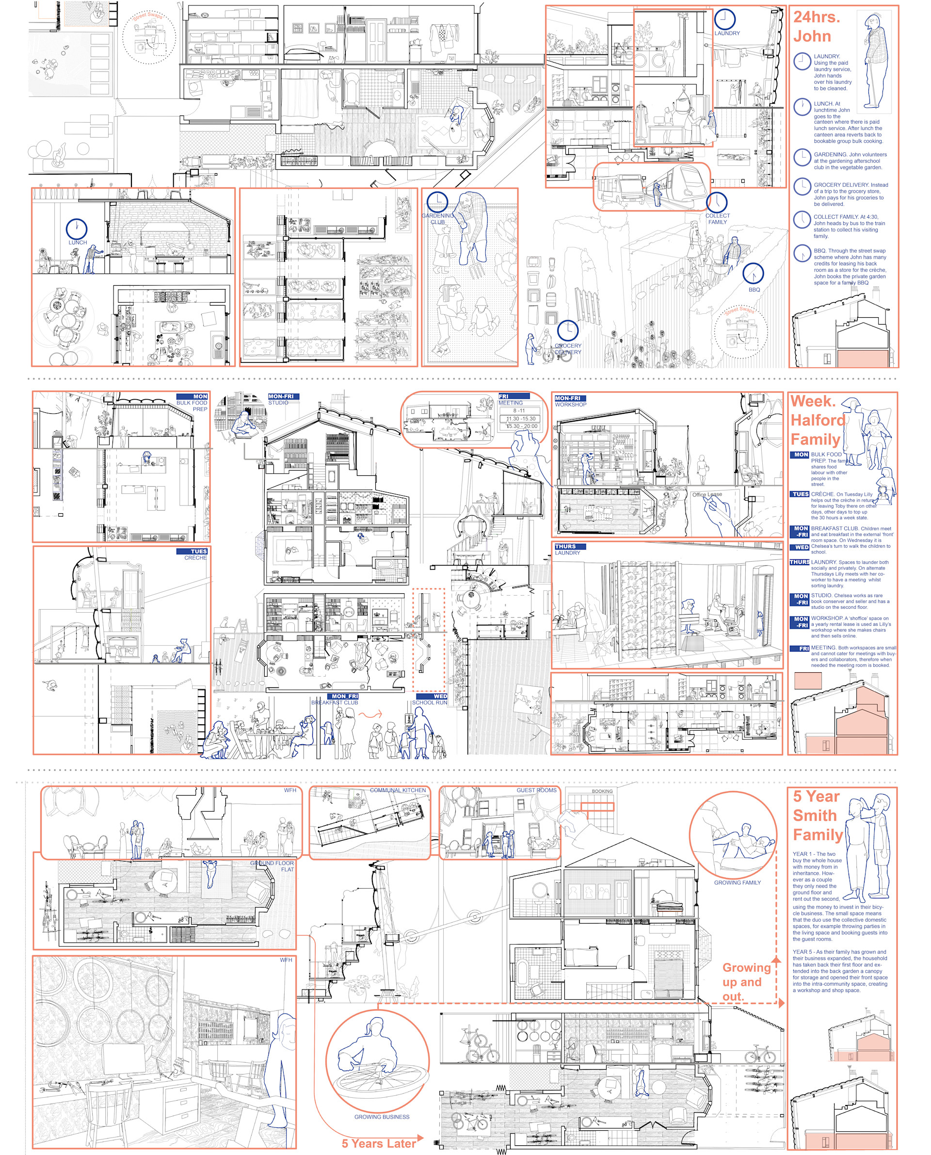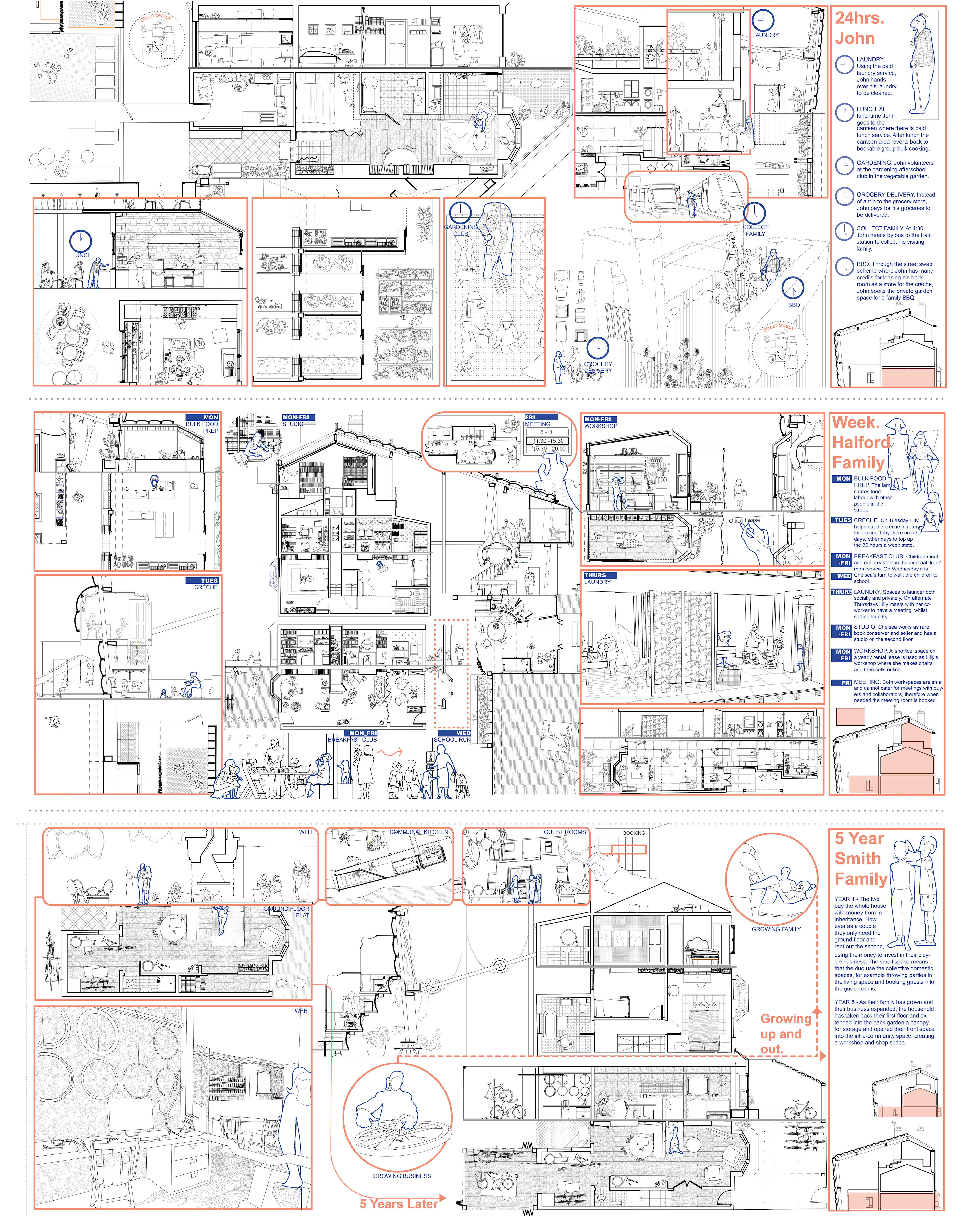 The project looks to densify a Victorian terrace street applying a bottom-up approach. Disrupting the Victorian typology and its ingrained public/private hierarchy, the houses are flipped. Domestic labours are no longer forced into small hidden back rooms and a new second skin façade creates communal intra-private spaces, both for socialising and economising domestic living and work.