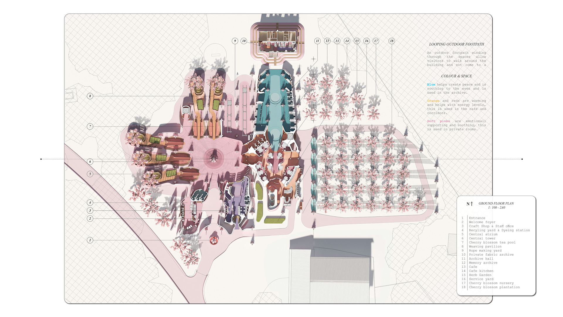 The building programme is a public memory archive that fosters communities’ memories of Hanami. In hopes of triggering this collective memory of the festival, elements such as, smell, colour, and craft (weaving) are investigated. These elements engage the five senses and help strengthen memory.